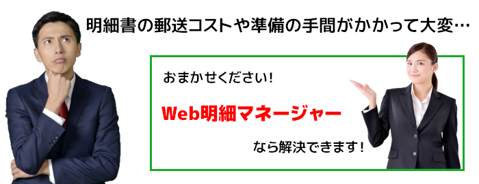 郵送の際の切手代やハガキの作成費が多く掛かったり、取引先企業様から明細の再発行の問い合わせ対応などに追われている状況でした。